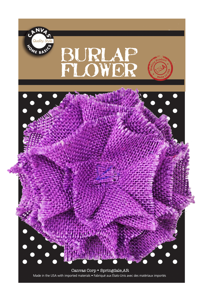 This handmade style, purple burlap flower is made with 100% jute, and is sewn onto a canvas disk for ease of adding to any project. Sewn with high attention to detail, the layers of burlap create a ruffled flower effect and measures approximately 4". They work perfectly for a variety of creative projects: DIY banners, DIY wedding decor, holiday projects, making headbands, apparel decor, gift wrapping, add to flips flops, home decor, mixed media projects, etc. Available in a wide range of colors, and no two flowers are alike. Made in Springdale, Arkansas.