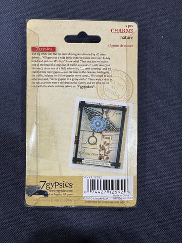 7Gypsies: Nature Charms (2 pc.) Bird & Bee. Brass circular charms with decorative bird and bee on either piece with a topaz colored bead embellished on top.  Great for decorating junk journals, scrapbooking, jewelry making accents.